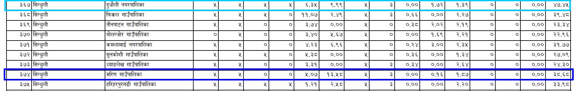 यसैगरी सुनकोशी गाउँपालिकाको २७.९ अंक, घ्याङलेख गाउँपालिका २४.३०, तीनपाटन गाउँपालिका २३.३४ र गोलन्जोर गाउँपालिकाले २२.९६ अंक पाएको छ ।