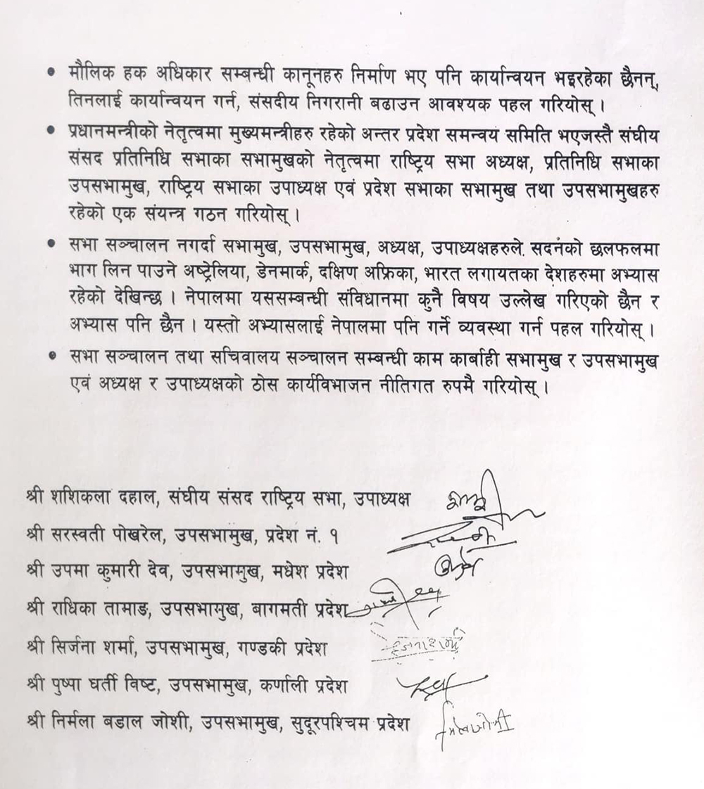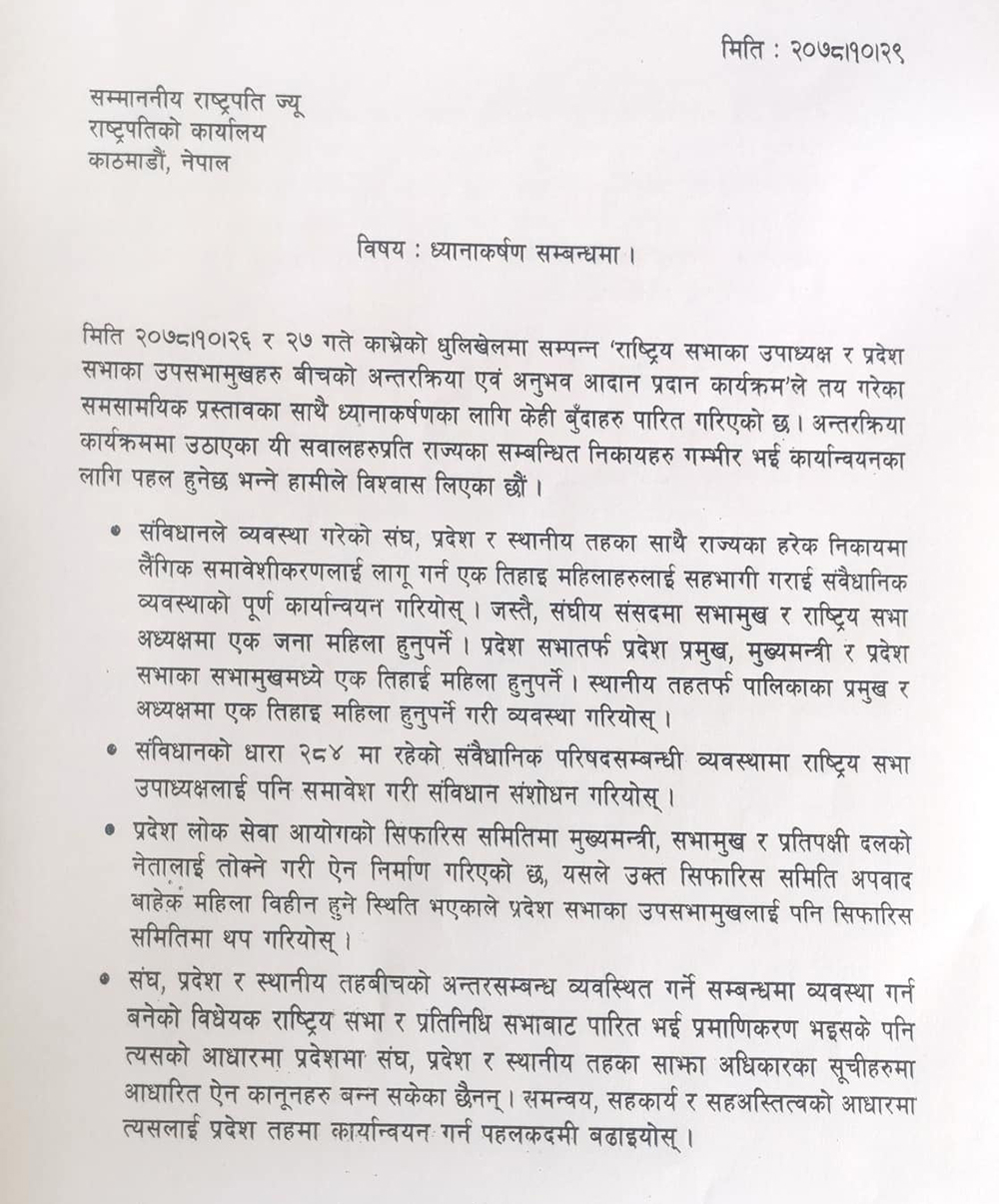 सङ्घीय संसद्मा सभामुख र राष्ट्रियसभा अध्यक्षमा एकजना महिला हुनुपर्ने, प्रदेशप्रमुख, मुख्यमन्त्री र प्रदेशसभाका सभामुखमध्ये एक तिहाइ महिला हुनुपर्ने, स्थानीय तहका पालिका प्रमुख र अध्यक्षमा पनि एक तिहाइ महिला हुनुपर्ने व्यवस्था गर्न पत्रमा उल्लेख गरेका छन् ।