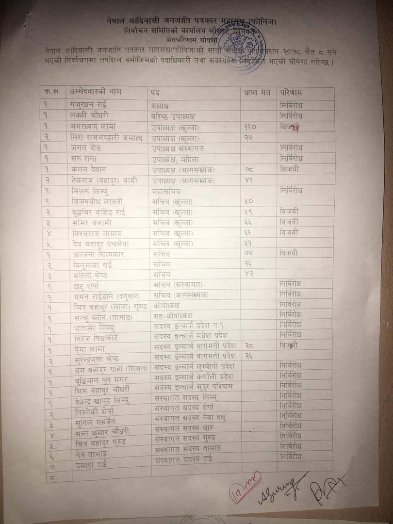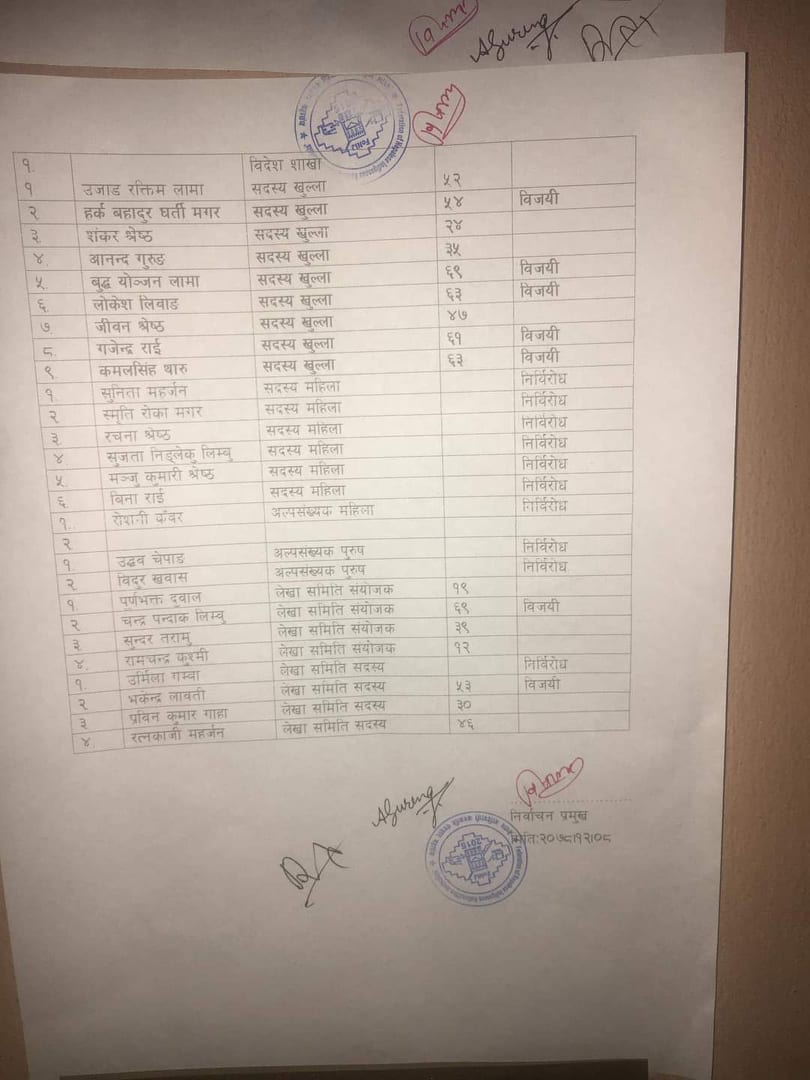 महासचिवमा मिलन लिम्बू निर्विरोध हुनुभएको छ भने सचिवहरुमा बुद्धबीर राई, समिर बलामी, विश्वराज तामाङ, अन्जना शिल्पकार मतदानबाट निर्वाचित हुनुभएको छ । त्यस्तै संस्थागत सचिवमा छेटु शेर्पा, अल्पसंख्यक सचिवमा यमन दनुवार, कोषाध्यक्षमा चित्रबहादुर गुरुङ, सहकोषाध्यक्षमा सञ्चु ब्लोन तामाङ निर्विरोध निर्वाचित हुनुभएको छ ।